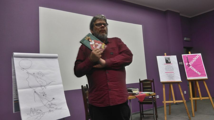 Podczas spotkania autor w ciekawy sposób mówił o swojej pracy i pasjach. Opowiadania o bohaterach swoich książek wzbogacał rysunkami, które szybko i sprawnie wychodziły spod jego ręki, wzbudzając ogólny entuzjazm. Dzieci miały możliwość poznania leśnika Piątka, małego szczura laboratoryjnego Ogryzka i krasnoludka Maurycego oraz innych wesołych bohaterów książek. Poznały one zapomniane postacie z polskich legend, między innymi: chochliki, rusałki, żabony, dziwożony, bagienniki, latawice Duże zainteresowanie wzbudziły książki historyczne, a szczególnie "Jagiełło pod prysznicem", w której autor w zabawny sposób przedstawia sylwetki polskich władców.