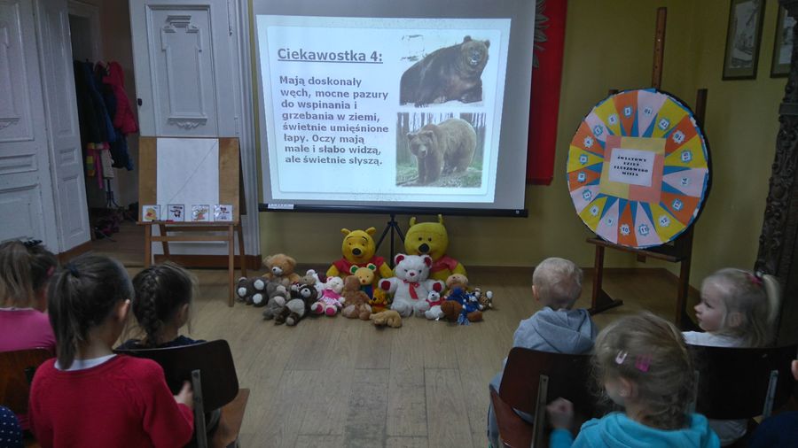 Na początku spotkania dzieci poznały historię powstania pluszowego misia. Następnie wysłuchały wierszy o misiach oraz rozwiązywały ciekawe misiowe zagadki. Wysłuchały także opowiadania pt. "Miś ogrodnik". Narysowały portret swojego pluszowego misia. Bawiły się przy znanych piosenkach o misiach.
