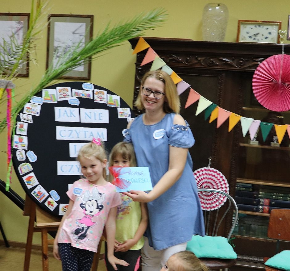 "Jak nie czytam jak czytam" odbyło się na gruncie lokalnym, zupełnie niezobowiązująco a jednak z pełnym zaangażowaniem. Po pierwsze, dzięki głównym bohaterom: sześcio- i siedmiolatkom z Przedszkola Samorządowego im. Marii Konopnickiej w Wąsoszu, którzy też już czytają (a nadto oglądają, wąchają i z radością chwytają po książki) oraz Burmistrzowi Wąsosza, Panu Pawłowi Niedźwiedziowi, który chętnie i z wyczuciem oddaje się głośnemu czytaniu dzieciom. My daliśmy po prostu przestrzeń, w której czytanie można łączyć z kreatywnością. Zaplanowany piknik z książką odbył się w.... sali, z powodu lekkiego chłodu na dworze. Humory na kocykach dopisywały - grupa Misiów, po wysłuchaniu historyjki o wikingu Tappim ("Tappi i awantura z olbrzymem" Marcin Mortka), obdarowała panie bibliotekarki własnoręcznie zilustrowaną książeczką, pt. "Misiowe opowieści". Z kolei Pani Elżbieta Poprawska, przygotowała dla dzieci formę mini-teatrzyku. Tym sposobem została zbudowana atmosfera zaciekawienia książką - mali czytelnicy ochoczo sięgali po las książeczek wokół nich, zapoznając się z kolorowymi stronami. Obowiązkowo, jak to na pikniku, panie bibliotekarki przygotowały również słodki poczęstunek. Natomiast Misie obiecały, że z pewnością wrócą do biblioteki po książki, ponieważ nic nie stoi na przeszkodzie, by czytać. Dziękujemy wszystkim osobom, które poświęciły swój czas, aby wspólnie spotkać się i wziąć udział w akcji.